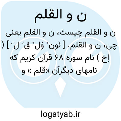 ن و القلم. [ نون ْ وَل ْ ق َ ل َ ] ( اِخ ) نام سوره 68 قرآن کریم که نامهای دیگرآن «قلم » و «نون » است و این سوره هزار و دویست و پنجاه و شش حرف و سیصد کلمت [ است و ] پنجاه ودو آیت جمله به مکه فرودآمد به قول بیشتر مفسران، ابن عباس و قتاده گفتند: از اول سورة تا «سنسمه علی الخرطوم » به مکه فرودآمد و از اینجا تا «و لعذاب الاَّخرة اکبر لوکانوا یعلمون » به مدینه فرودآمد و از اینجا تا «فهم یکتبون » به مکه فرودآمد و از اینجا تا «فجعله من الصالحین » به مدینه فرودآمد و از اینجا تا به آخر سوره به مکه فرودآمد. ( کشف الاسرار ج 10 ص 185 ). «قراء خلاف کردند در [ نون ]، بعضی اظهار کردند و بعضی اخفاء و عبداﷲبن عباس نون خواند به کسر نون علی اظهار حرف القسم. و عیسی بن عمرو خواند به فتح علی اضمار فعل، ای اقرء النون، مفسران در معنی او خلاف کردند: مجاهد ومقاتل و... گفتند که آن ماهی است که زمین بر پشت او نهاده است اول چیزی که خدای تعالی بیافرید قلم بود بر لوح برفت با آنچه خواست بودن. آنگه بخاری از آب برآورد و از آن بخار آسمان بیافرید، آنگه نون بیافرید، آن ماهی که زمین بر پشت او نهاده است و زمین بر پشت او بنهاد، نون بجنبید و زمین را بجنبانید...» ( تفسیر ابوالفتوح رازی ج 10 ص 93 ). النون؛ الحوت و الدواة، جمعه نینان. ( دائرة المعارف القرن عشرین ج 10 ).