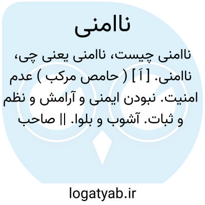 ناامنی. [ اَ ] ( حامص مرکب ) عدم امنیت. نبودن ایمنی و آرامش و نظم و ثبات. آشوب و بلوا. || صاحب منتخب اللغه در معنی دغدغه آرد: تردد و تشویش خاطر و ناامنی.