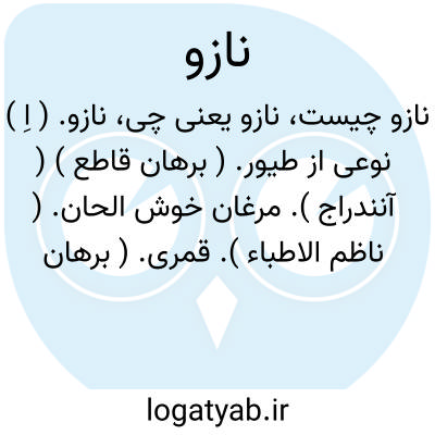 نازو. ( اِ ) نوعی از طیور. ( برهان قاطع ) ( آنندراج ). مرغان خوش الحان. ( ناظم الاطباء ). قمری. ( برهان ) ( آنندراج ) ( ناظم الاطباء ). رجوع به نارو شود. || درخت کاج. ( شمس اللغات ). رجوع به ناز و ناژو شود. || گربه. ( برهان ) ( آنندراج ) ( ناظم الاطباء ). نازی. رجوع به نازی شود. || ماه. قمر. ( ناظم الاطباء ). || ( ص نسبی ) در تداول، بسیارناز. پرناز. که ناز بسیار کند. نازی. اهل ناز.