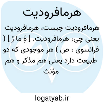 هرمافرودیت. [ هَِ ما رُ ] ( فرانسوی، ص ) هر موجودی که دو طبیعت دارد یعنی هم مذکر و هم مؤنث است. ( از اساطیر یونان و رم، تألیف پیر گریمال، ترجمه بهمنش ص 412 ). گیاهانی که دارای نافه و مادگی هستند، خواه دارای پریانت کامل بوده و یا فاقدآن باشند، گلهای هرمافرودیت نامیده میشوند مانند گلهای گندم، میخک، اطلسی، شب بو و غیره ولی گاهی بعضی از گلهای یک نبات ممکن است فاقد نافه و بعضی دیگر فاقد مادگی باشند. ( از گیاه شناسی ثابتی صص 423 - 424 ).