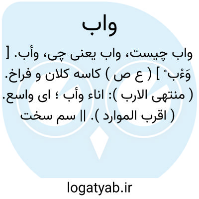 وأب. [ وَءْب ْ ] ( ع ص ) کاسه کلان و فراخ. ( منتهی الارب ): اناء وأب؛ ای واسع. ( اقرب الموارد ). || سم سخت بهم چسبیده سر و سم سبک یاسم قبه دار بسیار درگیرنده زمین را یا سم نیکو بزرگ مقدار. شتر کلان جثه. || ( مص ) شرمنده شدن. سردر کشیدن و ترنجیده شدن از شرم. ( منتهی الارب ). اِبَه به همین معنی است. ( منتهی الارب ) ( اقرب الموارد ).