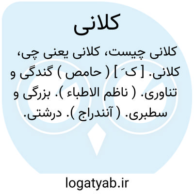 کلانی. [ ک َ ] ( حامص ) گندگی و تناوری. ( ناظم الاطباء ). بزرگی و سطبری. ( آنندراج ). درشتی. ضخمی. ( یادداشت به خط مرحوم دهخدا ). عُظم. ( منتهی الارب ). بزرگ بودن: