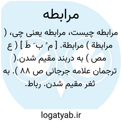 ( مرابطة ) مرابطة. [ م ُ ب َ طَ ] ( ع مص ) به دربند مقیم شدن.( ترجمان علامه جرجانی ص 88 ). به ثغر مقیم شدن. رباط. ( تاج المصادر بیهقی ) ( زوزنی ) ( از اقرب الموارد ). ملازمت نمودن جای درآمدن دشمن. ( از منتهی الارب ). سرحدداری. ملازمت سرحد خصم. ( یادداشت مؤلف ). اسبان را در رباط مرزی آماده و مهیا نگه داشتن و ملازم مرز و جهاد بودن؛ فهو مرابط. ( از متن اللغة ). نگاهبانی سرحد. ( فرهنگ فارسی معین ): اما مرابطه در سبیل خدای تعالی در وی فضل بسیار است. ( ترجمه النهایه طوسی، از فرهنگ فارسی معین ). || مواظبت کردن بر امری. رباط. ( از اقرب الموارد ) ( از متن اللغة ). نگاه داشتن. ( از منتهی الارب ).
