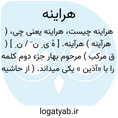 ( هر آینه ) ۱- بتحقیق بی شک قطعا لابد: (( پسرگفت: هر آینه تا رنج نبری گنج برنداری. ) ) توضیح ۱- مرحوم بهار نوشته: (( هر آیینه که بتخفیف هر آینه شدهومعنی آن بهرقاعدهوبهر آیین است که ماحالا بهرصورت گوییم همه ازهمین اصل و ریش. (( آذین ) )است چنانکه دربالا آمده. ادونک همریش. آذین است. توضیح ۲- هر آینه درفارسی ازادوات تاکید است. واغلب درسرجواب شرط درمی آید واستعمال آن جزدرمورد تاکیدصحیح نیست گاهی دیدهمیشود که آنرا بجای یکی از ادوات شرط بکارمیبرندمانند: (( هر آینه تحصیل کنی بسعادت خواهی رسید ) ) درصورتی که بایدنوشتهشود: ((اگر تحصیل کنی هر آینه بسعادت خواهی رسید. ) )
