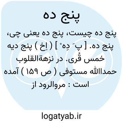 پنج ده. [ پ َ دِه ْ ] ( اِخ ) پنج دیه خمس قُری. در نزهةالقلوب حمداﷲ مستوفی ( ص 159 ) آمده است: مروالرود از اقلیم چهارم است طولش ازجزایر خالدات ضر و عرض از خط استوا لوک از قصبات آن پنج دیه بوده که سلطان ملکشاه ساخت. دور باروش پنج هزار گام است و گرمسیر است اما هوای درست دارد و آبی گوارنده و اکثر اوقات آنجا ارزانی بود و از میوه هاش انگور و خربزه سخت نیکوست چند پاره دیه از توابع آن است - انتهی. مرحوم علامه قزوینی گوید: پنجده ناحیه ٔمعروفی بوده است در خراسان از نواحی شهر مروالرود ( بالامرغاب امروزی ) و در نسبت به آن بنجدیهی و فنجدیهی و بندهی ( پندهی، پنجدهی ) همه این صور استعمال شده است. ( معجم البلدان ) و اکنون نیز نام قریه پنج ده درنقشه های مبسوط بر لب رود مرغاب در خاک روسیه بکلی نزدیک سرحد شمالی افغانستان اندکی در شمال غربی قصبه ٔبالامرغاب دیده میشود. ( شدالازار تألیف معین الدین ابوالقاسم جنید ص 416 حاشیه ( 2 ) بقلم علامه قزوینی ).