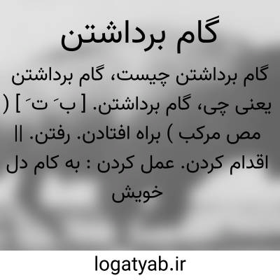( مصدر ) ۱ - براه افتادن قدم برداشتن گام برگرفتن رفتن: به بهزاد بنمای زین ولگام چو او رام گردد تو بردار گام. ۲ - عمل کردن رفتار کردن: بکام دل خویش برداشت گام شده شاد دل یافته کام و نام.