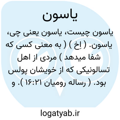 یاسون. ( اِخ ) ( به معنی کسی که شفا میدهد ) مردی از اهل تسالونیکی که از خویشان پولس بود. ( رساله رومیان 16:21 ). و دور نیست که سبب حبس شدنش بواسطه این بودکه پولس را مهمان کرد و پس از آن ضمانت از وی گرفته وی را رها کرد. ( اعداد: 17:9 ) ( قاموس کتاب مقدس ).