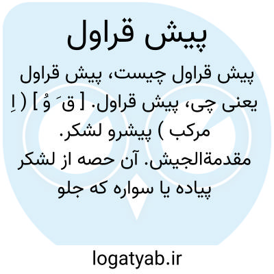 پیش قراول. [ ق َ وُ ] ( اِ مرکب ) پیشرو لشکر. مقدمةالجیش. آن حصه از لشکر پیاده یا سواره که جلو حرکت میکند. طلیعه. چرخچی. مقدمه. پیشرو.