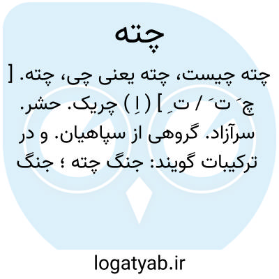 چته. [ چ َ ت َ / ت ِ ] ( اِ ) چریک. حشر. سرآزاد. گروهی از سپاهیان. و در ترکیبات گویند: جنگ چته؛ جنگ پارتیزانی. جنگ با دسته های کوچک در جاهای مختلف. قشون چته؛ قشون چریک. دسته پارتیزان. || گروهی از رهزنان مسلح.