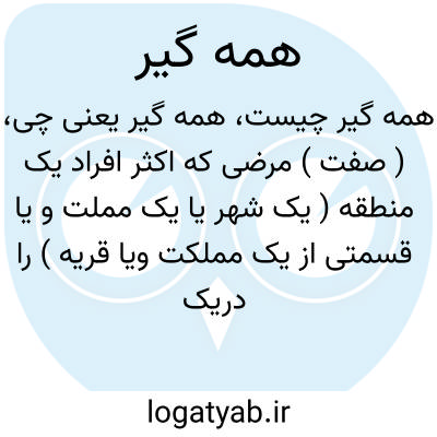 ( صفت ) مرضی که اکثر افراد یک منطقه ( یک شهر یا یک مملت و یا قسمتی از یک مملکت ویا قریه ) را دریک زمان مبتلا کند همه گیری غالبا در اثر اشاع. امراض خطرناک مانند وبا حصبه تیفوس و طاعون اتفاق می افتد و مرگ و میر بسیار را موجب میشود.