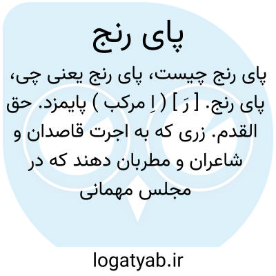 پای رنج. [ رَ ] ( اِ مرکب ) پایمزد. حق القدم. زری که به اجرت قاصدان و شاعران و مطربان دهند که در مجلس مهمانی حاضر شوند. ( برهان ). انعام و زری که به قاصد یا میهمان داده شود. ( غیاث اللغات ). مقابل دسترنج. ( آنندراج ):