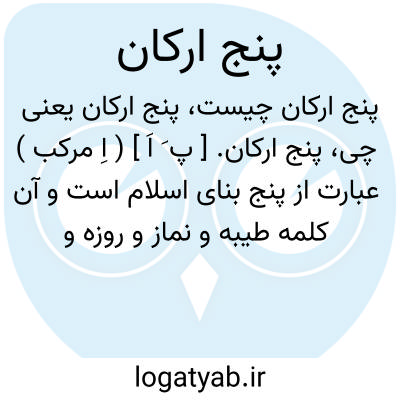 پنج ارکان. [ پ َ اَ ] ( اِ مرکب ) عبارت از پنج بنای اسلام است و آن کلمه طیبه و نماز و روزه و حج و زکوة است. ( غیاث اللغات ).