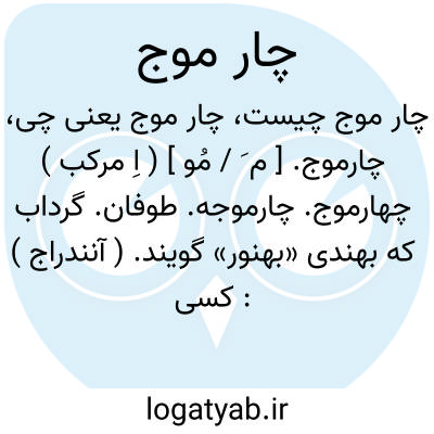 چارموج. [ م َ / مُو ] ( اِ مرکب ) چهارموج. چارموجه. طوفان. گرداب که بهندی «بهنور» گویند. ( آنندراج ):