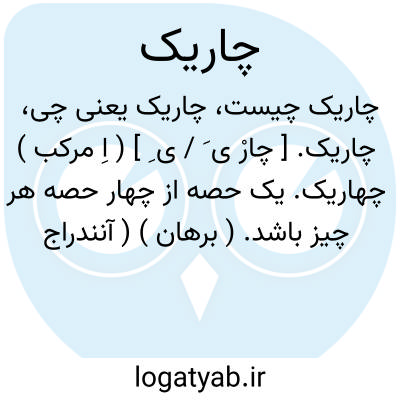 چاریک. [ چارْ ی َ / ی ِ ] ( اِ مرکب ) چهاریک. یک حصه از چهار حصه هر چیز باشد. ( برهان ) ( آنندراج ). ربع. یک چهارم. یک قسمت از چهار قسمت هر چیز. یک بخش از چهار بخش هر چیز: