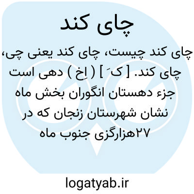 چای کند. [ ک َ ] ( اِخ ) دهی است جزء دهستان انگوران بخش ماه نشان شهرستان زنجان که در 27هزارگزی جنوب ماه نشان و 6هزارگزی راه مالرو عمومی واقعشده. کوهستانی و سردسیر است و 180 تن سکنه ترک زبان دارد. آبش از رودخانه قشلاق جوق، محصولش غلات، یونجه و قلمستان، شغل اهالی زراعت و بافتن گلیم و جاجیم وراهش مالرو است. ( از فرهنگ جغرافیایی ایران ج 2 ).
