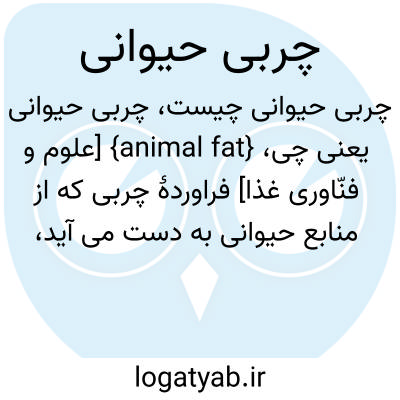 {animal fat} [علوم و فنّاوری غذا] فراوردۀ چربی که از منابع حیوانی به دست می آید، مانند کره و دنبه و پی گوسفند و روغن ماهی
