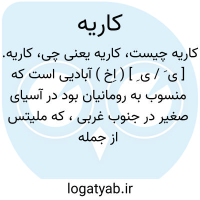 کاریه. [ ی َ / ی ِ ] ( اِخ ) آبادیی است که منسوب به رومانیان بود در آسیای صغیر در جنوب غربی، که ملیتس از جمله شهرهای آن است و قنیدس نیز یکی از آنها میباشد ( قاموس کتاب مقدس ). و رجوع به ایران باستان ص 460، 646، 649، 651، 693، 694، 717، 926، 1021، 1022، 1099، 1101، 1104، 1112، 1138، 1169، 1185، 1210، 1245، 1268، 1274، 1275، 1454، 1462، 1468، 1608، 1973، 1993، 2033، 2034، 2093، 2101، 2154، 2034، 2344 شود. نیز رجوع به «کاریا» شود.