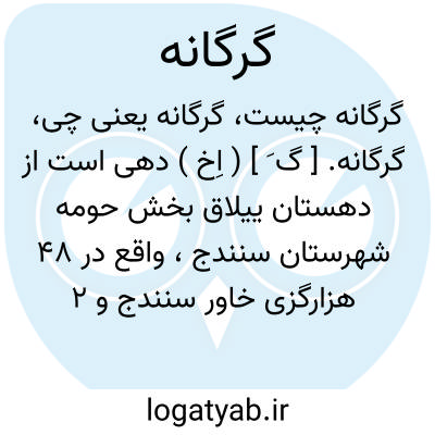 گرگانه. [ گ َ ] ( اِخ ) دهی است از دهستان ییلاق بخش حومه شهرستان سنندج، واقع در 48 هزارگزی خاور سنندج و 2 هزارگزی جنوب باختر قادرمز. هوای آن سرد و دارای 240 تن سکنه است. آب آنجا از چشمه و محصول آن غلات و شغل اهالی زراعت وصنایع دستی آنان قالیچه و جاجیم و گلیم بافی است و راه آن مالرو است. ( از فرهنگ جغرافیایی ایران ج 5 ).