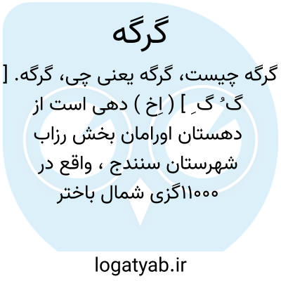گرگه. [ گ ُ گ ِ ] ( اِخ ) دهی است از دهستان اورامان بخش رزاب شهرستان سنندج، واقع در 11000گزی شمال باختر رزاب و 1000گزی خاور اتومبیل رو مریوان به رزاب. هوای آن سرد، دارای 220 تن سکنه است. آب آنجا از چشمه تأمین میشود. محصول آن غلات و حبوبات ولبنیات و توتون و شغل اهالی زراعت و گله داری است. راه آن مالرو است. ( از فرهنگ جغرافیایی ایران ج 5 ).