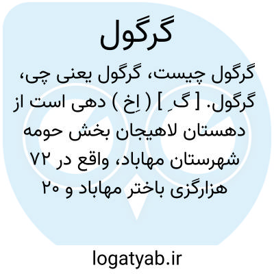 گرگول. [ گ ِ ] ( اِخ ) دهی است از دهستان لاهیجان بخش حومه شهرستان مهاباد، واقع در 72 هزارگزی باختر مهاباد و 20 هزارگزی باختر شوسه مهاباد به ارومیه. هوای آن سرد، دارای 175 تن سکنه است. آب آنجا از رودخانه نقده تأمین میشود. محصول آن غلات و توتون و حبوبات و شغل اهالی زراعت و گله داری و صنایع دستی آنان جاجیم بافی و راه آن مالرو است. در دو محل بفاصله 4 هزارگز بنام گرگول بالا و پائین مشهور، سکنه گرگول پائین 120 تن میباشد. ( از فرهنگ جغرافیایی ایران ج 4 ).