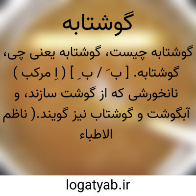 گوشتابه. [ ب َ / ب ِ ] ( اِ مرکب ) نانخورشی که از گوشت سازند، و آبگوشت و گوشتاب نیز گویند.( ناظم الاطباء ). نشیله. ( مهذب الاسماء ). مدققه. ( یادداشت مؤلف ). مدقوقه. ( یادداشت مؤلف ). گوشتاوه: و دفع مضرت [ شراب ممزوج و مروق ] با گوشتابه و قلیه با توابل و افزار بسیار کنند. ( نوروزنامه ).