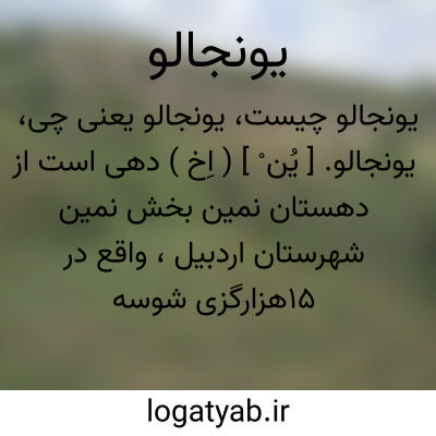 یونجالو. [ یُن ْ ] ( اِخ ) دهی است از دهستان نمین بخش نمین شهرستان اردبیل، واقع در 15هزارگزی شوسه اردبیل به نمین، با 247 تن سکنه. آب آن از چشمه و راه آن مالرو است. ( از فرهنگ جغرافیایی ایران ج 4 ).