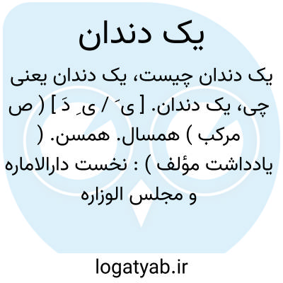 یک دندان. [ ی َ / ی ِ دَ ] ( ص مرکب ) همسال. همسن. ( یادداشت مؤلف ): نخست دارالاماره و مجلس الوزاره که آن درگاه بارگاه سلطان است مشتمل بر دیوانخانه های مرتب... و خدم و حواشی و جوانان یک رنگ و یک دندان نوخاسته. ( ترجمه محاسن اصفهان ص 51 ).