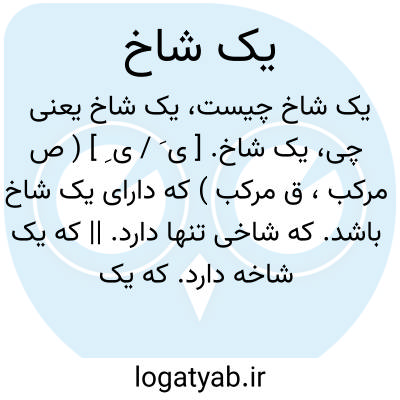 یک شاخ. [ ی َ / ی ِ ] ( ص مرکب، ق مرکب ) که دارای یک شاخ باشد. که شاخی تنها دارد. || که یک شاخه دارد. که یک شعبه دارد. || بر یک دوش. با یک دوش. ( یادداشت مؤلف ). یک وری: فلان کس قبایش را یک شاخ روی شانه اش انداخته بود. ( از فرهنگ لغات عامیانه ).