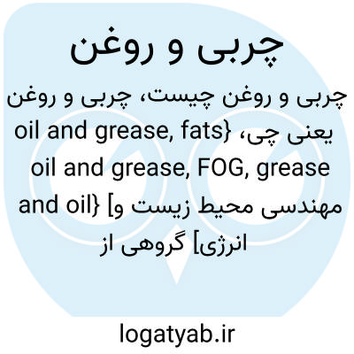 {oil and grease, fats oil and grease, FOG, grease and oil} [مهندسی محیط زیست و انرژی] گروهی از ترکیبات آلی نامحلول در آب، شامل بقایای چربی حیوانی و موم و اسیدهای چرب آزاد و صابون و روغن های معدنی و روان سازها و برخی مواد غیرچرب، که در فاضلاب یافت می شوند