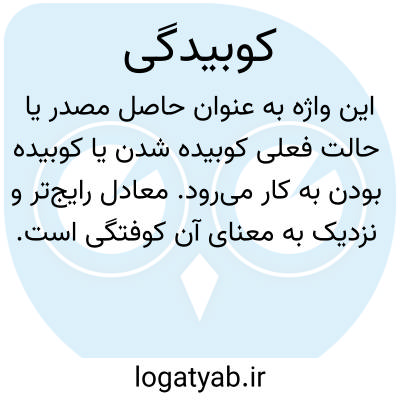 این واژه به عنوان حاصل مصدر یا حالت فعلی کوبیده شدن یا کوبیده بودن به کار می‌رود. معادل رایج‌تر و نزدیک به معنای آن کوفتگی است که نشان‌دهنده اثرات ناشی از ضربه، فشار یا ساییدگی می‌باشد. این واژه باید در ارتباط با واژگان کوبیده، کوبیدن (فعل) و کوفتگی (حامص) مورد بررسی و فهم قرار گیرد. این ارجاعات نشان‌دهنده پیوند معنایی و ریشه‌شناختی کوبیدگی با مفاهیم مرتبط با عمل ضربه زدن، فرآیند کوبیده شدن و نتیجه حاصل از آن است. بنابراین، درک کامل کوبیدگی مستلزم توجه به این واژگان هم‌خانواده و ارتباط مفهومی آن‌ها با یکدیگر است.