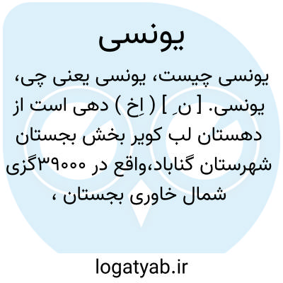 یونسی. [ ن ِ ] ( اِخ ) دهی است از دهستان لب کویر بخش بجستان شهرستان گناباد،واقع در 39000گزی شمال خاوری بجستان، با 498 تن سکنه. آب آن از قنات و راه آن مالرو است. مزرعه علی آباد جزء این ده است. ( از فرهنگ جغرافیایی ایران ج 9 ).