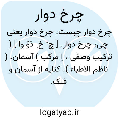 چرخ دوار. [ چ َ خ ِ دَوْ وا ] ( ترکیب وصفی، اِ مرکب ) آسمان. ( ناظم الاطباء ). کنایه از آسمان و فلک. چرخ. چرخ گردنده. چرخ گردان: