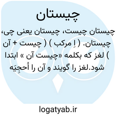 چیستان. ( اِ مرکب ) ( چیست + آن ) لغز که بکلمه «چیست آن » ابتدا شود.لغز را گویند و آن را اُحجِیَه نیز گویند. ( جهانگیری ). به معنی پرسیدن باشد و آن را لغز هم گویند و به عربی اغلوطه خوانند. ( برهان ). دیسان. لغز. اغلوطه. ( از لغت محلی شوشتر نسخه خطی ذیل دیسان ). آبِدَه. ( زمخشری ). اُدعیَه. اُدعُوَّه. اُحجُوَّه. حُجَیّ̍ا. اُلغُوزُه. بردک. بَرد. پَرد. چَربَک. ( یادداشت مؤلف ).لُغَز. لُغُز. لَغَز. لَغز. لُغَیزاء. لُغَّیزی ̍. ( منتهی الارب ). و آن را پرد و پردک نیز گویند؛ یعنی پوشیده و در پرده. ( آنندراج ) ( از انجمن آرا ). شمس قیس رازی گوید: لغز آن است که معنیی از معانی در کسوت عبارتی مشکل متشابه بطریق سؤال بپرسند و از این جهت درخراسان آن را «چیست آن » خوانند و این صنعت چون عذب و مطبوع افتد و اوصاف آن از روی معنی با مقصود مناسبتی دارد و بحشو الفاظ دراز نگردد و از تشبیهات کاذب و استعارات بعید دور بود پسندیده باشد و تشحیذ خاطر را بشاید. ( المعجم فی معاییر اشعار العجم چ مدرس رضوی صص 314 - 313 ). رشیدالدین وطواط گوید: لغز - این صنعت همان معماست الا که این را بطریق سؤال گویند و عجم این را چیستان خوانند. ( حدائق السحر ):