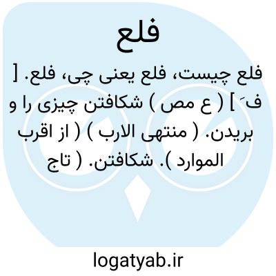 فلع. [ ف َ ] ( ع مص ) شکافتن چیزی را و بریدن. ( منتهی الارب ) ( از اقرب الموارد ). شکافتن. ( تاج المصادر بیهقی ): فلع رأسه بالسیف و الحجر. || واضح ساختن. ( از اقرب الموارد ).