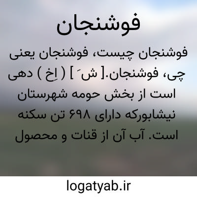 فوشنجان.[ ش َ ] ( اِخ ) دهی است از بخش حومه شهرستان نیشابورکه دارای 698 تن سکنه است. آب آن از قنات و محصول عمده اش غله میباشد. ( از فرهنگ جغرافیایی ایران ج 9 ).