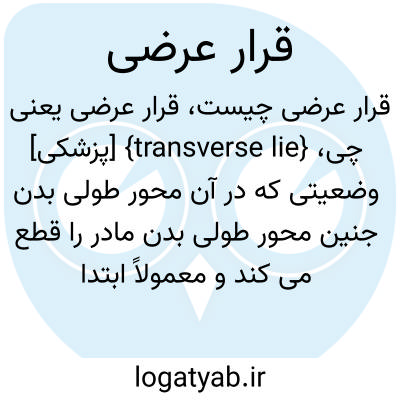 {transverse lie} [پزشکی] وضعیتی که در آن محور طولی بدن جنین محور طولی بدن مادر را قطع می کند و معمولاً ابتدا شانه ها ظاهر می شوند، ولی بازو یا هر بخش از تنه نیز ممکن است ظاهر شود