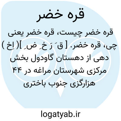 قره خضر. [ ق َ رَ خ ِ ض ِ ]( اِخ ) دهی از دهستان گاودول بخش مرکزی شهرستان مراغه در 44 هزارگزی جنوب باختری مراغه و یک هزارگزی خاورشوسه مراغه به میاندوآب. موقع جغرافیایی آن جلگه ومعتدل مالاریایی است. سکنه آن 327 تن. آب آن از رودخانه لیلان و قنات و محصول آن غلات، چغندر، کشمش، نخود. شغل اهالی زراعت و صنایع دستی زنان جاجیم بافی است. راه مالرو دارد. ( از فرهنگ جغرافیایی ایران ج 4 ).