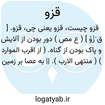 قزو. [ ق َزْوْ ] ( ع مص ) دور بودن از آلایش و پاک بودن از گناه. ( از اقرب الموارد ) ( منتهی الارب ). || به عصا بر زمین نکتها کردن. ( منتهی الارب ). گویند: قزا قزواً بعصاه الارض؛ نکتها بها. ( اقرب الموارد ). || قُزَة باختن. ( منتهی الارب ). بازی کردن با قُزَة. ( اقرب الموارد ).