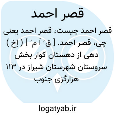 قصر احمد. [ ق َ اَ م َ ] ( اِخ ) دهی از دهستان کوار بخش سروستان شهرستان شیراز در 113 هزارگزی جنوب باختری سروستان و 6 هزارگزی شوسه شیراز به خضر. موقع جغرافیایی آن جلگه و معتدل مالاریایی است. سکنه آن 498 تن است. آب آن از رودخانه قره آغاج و قنات و محصول آن غلات، چغندر، صیفی، میوه جات و شغل اهالی زراعت و باغبانی است. راه مالرو دارد. ( از فرهنگ جغرافیایی ایران ج 7 ).