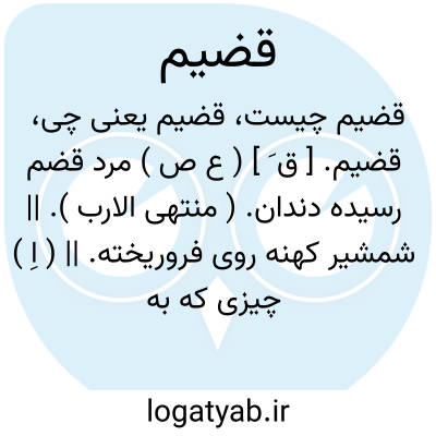 قضیم. [ ق َ ] ( ع ص ) مرد قضم رسیده دندان. ( منتهی الارب ). || شمشیر کهنه روی فروریخته. || ( اِ ) چیزی که به کرانه دندان گزند وخورند. || چرم سپید که بر آن نویسند. ( اقرب الموارد ) ( منتهی الارب ). || کیسه چرمین. ( منتهی الارب ). نطع. ( اقرب الموارد ). || جامه دان چرمین، یا ادیم هرچه باشد، و گستردنی از ادیم. || نامه سپید. || علف و جو ستور. || سیم. || بوریا که به جای رشته اش تسمه باشد. ( اقرب الموارد ) ( منتهی الارب ).