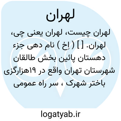 لهران. [ ] ( اِخ ) نام دهی جزء دهستان پائین بخش طالقان شهرستان تهران واقع در 19هزارگزی باختر شهرک، سر راه عمومی مالروی قزوین. کوهستانی و سردسیر. دارای 326 تن سکنه. آب آن از چشمه سار. محصول آنجا غلات و گردو. شغل اهالی زراعت و صنایع دستی آنان کرباس و گلیم و جاجیم بافی و راه آن مالرو است. مزرعه دیمی زار مشهور به رزگره شسته جزء این ده است. ( از فرهنگ جغرافیائی ایران ج 1 ).