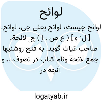 لوائح. [ ل َ ءِ ] ( ع ص، اِ ) ج ِ لائحة. صاحب غیاث گوید: به فتح روشنیها جمع لائحة ونام کتاب در تصوف... و آنچه در ابتدای تاج المدائح طغرا لوائح به معنی جمع لوح مستفاد میشود در هیچ کتاب لغت و صرف به ثبوت نمیرسد - انتهی. جرجانی گوید: هی یلوح من الاسرار الظاهرة من السمو من حال الی حال و عندنا ما یلوح للبصر اذا لم یتقید بالجارحة من الانوار الذاتیة لا من جهت القلب. ( تعریفات اصطلاحات صوفیه ).