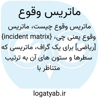 {incident matrix} [ریاضی] برای یک گراف، ماتریسی که سطرها و ستون های آن به ترتیب متناظر با رأس ها و یال های گراف اند و درایۀ (i, j ) اُم آن برابر 1 است هرگاه رأس i اُم بر یال j اُم واقع باشد و در غیر این صورت برابر صفر است