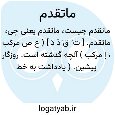 ماتقدم. [ ت َ ق َدْ دَ ] ( ع ص مرکب، اِ مرکب ) آنچه گذشته است. روزگار پیشین. ( یادداشت به خط مرحوم دهخدا ). گذشته و ماضی. ( آنندراج ). هر چیز پیش گرفته و مقدم شده و زمان گذشته و زمان قدیم. ( ناظم الاطباء ): از دیوانهای شعرای ماتقدم جمع کرد. ( دیباچه فرهنگ اسدی ). آدم عهد ماتقدم را فراموش کرد. ( قصص الانبیاء ص 19 ). گویند که در روزگار ماتقدم پادشاه زاده ای بود. ( تحفةالملوک ).