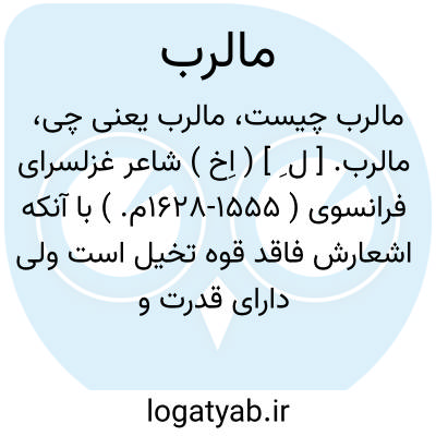 مالرب. [ ل ِ ] ( اِخ ) شاعر غزلسرای فرانسوی ( 1555-1628م. ) با آنکه اشعارش فاقد قوه تخیل است ولی دارای قدرت و روشنی و وزنی مطبوع است. او در مقام شاعری مبدع و نوآور بود و بر زبان و شعر فرانسه نفوذ کرد.«بوالو» درباره وی گفته: «بالاخره مالرب آمد...».او مورد ستایش نامداران کلاسیک فرانسه قرار گرفت و دو قرن سرمشق گویندگان زبان فرانسه بود. ( از لاروس ).