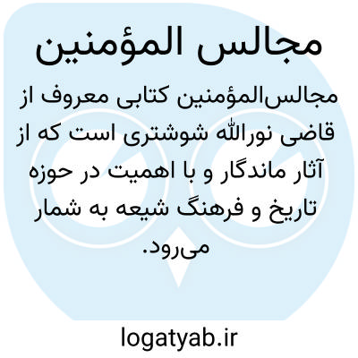 [ویکی شیعه] مجالس المؤمنین (کتاب). ﻣَﺠﺎﻟِﺲُ ﺍﻟﻤﺆﻣﻨﻴﻦ کتابی به زبان عربی نوشته سید نورالله حسینی شوشتری(۱۰۱۹ق) مؤلف کتاب احقاق الحق و ازهاق الباطل است. این کتاب در دوازده «مجلس» تدوین شده و هر مجلس حکم یک فصل از کتاب را دارد. شوشتری در هر مجلس، به گوشه هایی از تاریخ اسلام، تشیع و ایران پرداخته و برخی از بزرگان تصوف، متکلمان، مشاهیر، حکما و شعرا را معرفی کرده است.
