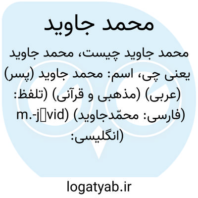 اسم: محمد جاوید (پسر) (عربی) (مذهبی و قرآنی) (تلفظ: m.-jāvid) (فارسی: محمّدجاوید) (انگلیسی: mohammad-javid) معنی: ترکیب دو اسم محمد و جاوید ( ستوده و جاودان )، از نام های مرکب، ا محمّد و جاوید