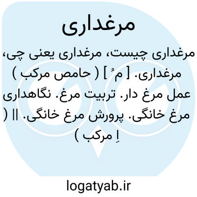 مرغداری. [ م ُ ] ( حامص مرکب ) عمل مرغ دار. تربیت مرغ. نگاهداری مرغ خانگی. پرورش مرغ خانگی. || ( اِ مرکب ) محل و مکانی که در آنجا مرغان خانگی پرورش دهند.