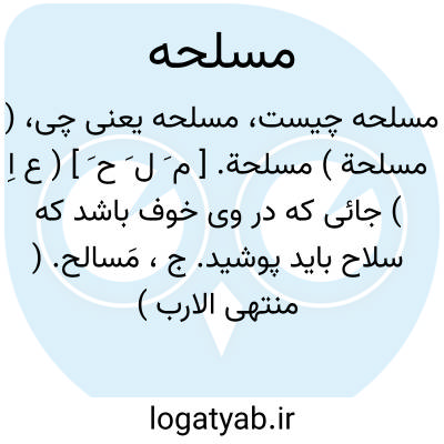 ( مسلحة ) مسلحة. [ م َ ل َ ح َ ] ( ع اِ ) جائی که در وی خوف باشد که سلاح باید پوشید. ج، مَسالح. ( منتهی الارب ) ( آنندراج ). جائی که در وی خوف و ترس باشد و لازم باشد در آن سلاح با خودبرداشتن. ( ناظم الاطباء ). جای ترس از رخنه های شهر و سرحد مملکت. ( ناظم الاطباء ). گذرگاه دشمن. ( یادداشت مرحوم دهخدا ). موضع سلاح مانند سرحد. ( از اقرب الموارد ). || سلاح دان. ( مهذب الاسماء ). || جای دیده بان. ( منتهی الارب ). مرقب. ( اقرب الموارد ). || قومی سلاح ور. ( منتهی الارب ) ( از اقرب الموارد ). مردم باسلاح. مردمان باسلاح. ( یادداشت مرحوم دهخدا ). سلاح داران. ( دهار ). گروه سلاح دار. || نگهبان. ( ناظم الاطباء ). نگاهبانان. ( منتهی الارب ).
