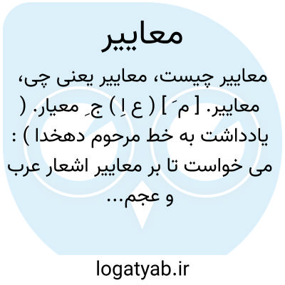 (اسم ) جمع معیار: عیارها اندازه ها: میخواست تا بر معاییر اشعار عرب و عجم... واقف شود...